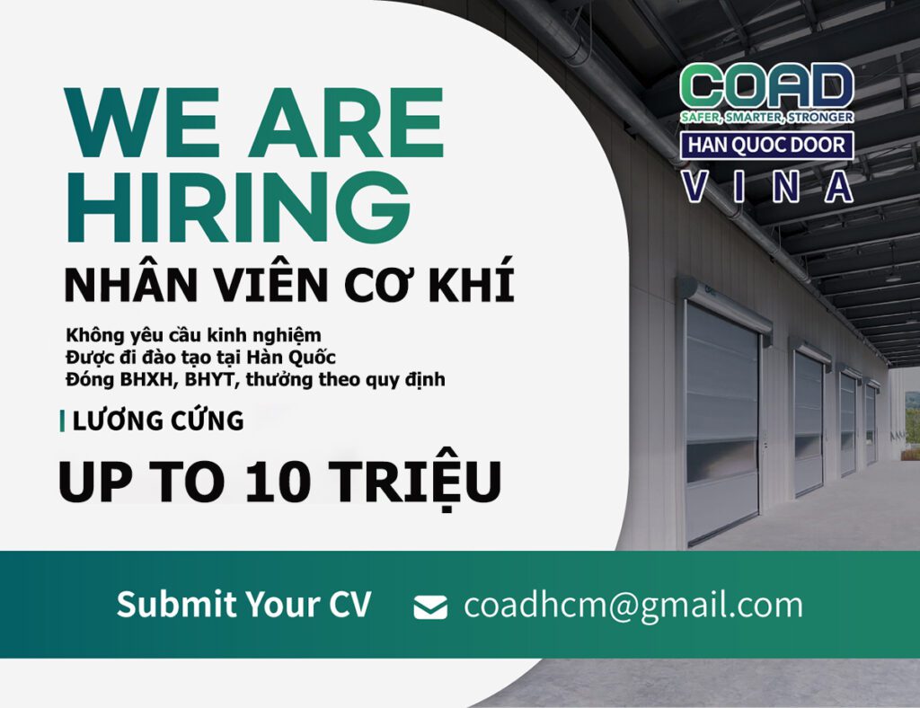 Công ty TNHH Cửa tự động Hàn Quốc (COAD VINA) chuyên sản xuất cửa cuốn nhanh, cửa trượt trần, cửa tự động công nghiệp thông báo tuyển dụng vị trí Nhân viên Cơ khí – Đợt 11/ 2024